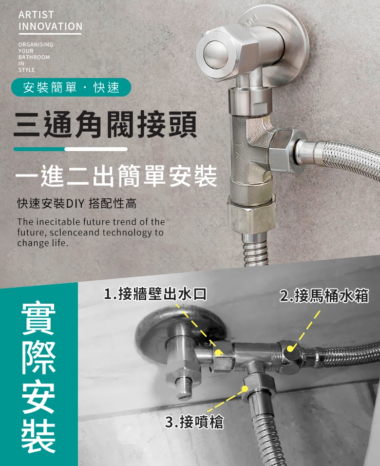 A不鏽鋼噴頭軟管組(附無痕貼掛架)-內含:噴槍主體x1/1.5m軟管x1/無痕貼掛架x1/三通轉接頭x1/止洩帶x1