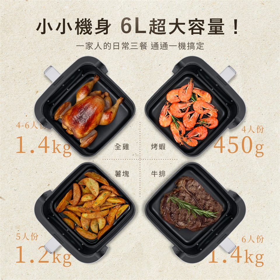 煎/烤/炒/炸/烘,各種料理通通一機搞定,10種智慧菜單,精準控溫控時,6吋玻璃透視窗,料理狀態隨時看,有效鎖住食材水份和營養,外酥內軟
