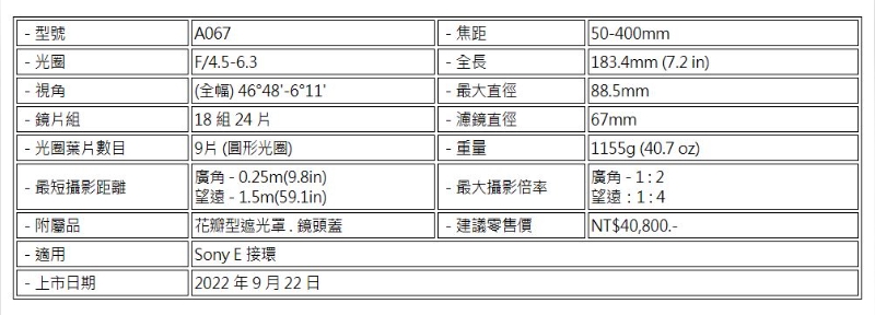 從 50mm 開始,八倍變焦,適用於 Sony E 接環全幅無反光鏡相機的遠攝變焦鏡,提供更多拍攝功能性。