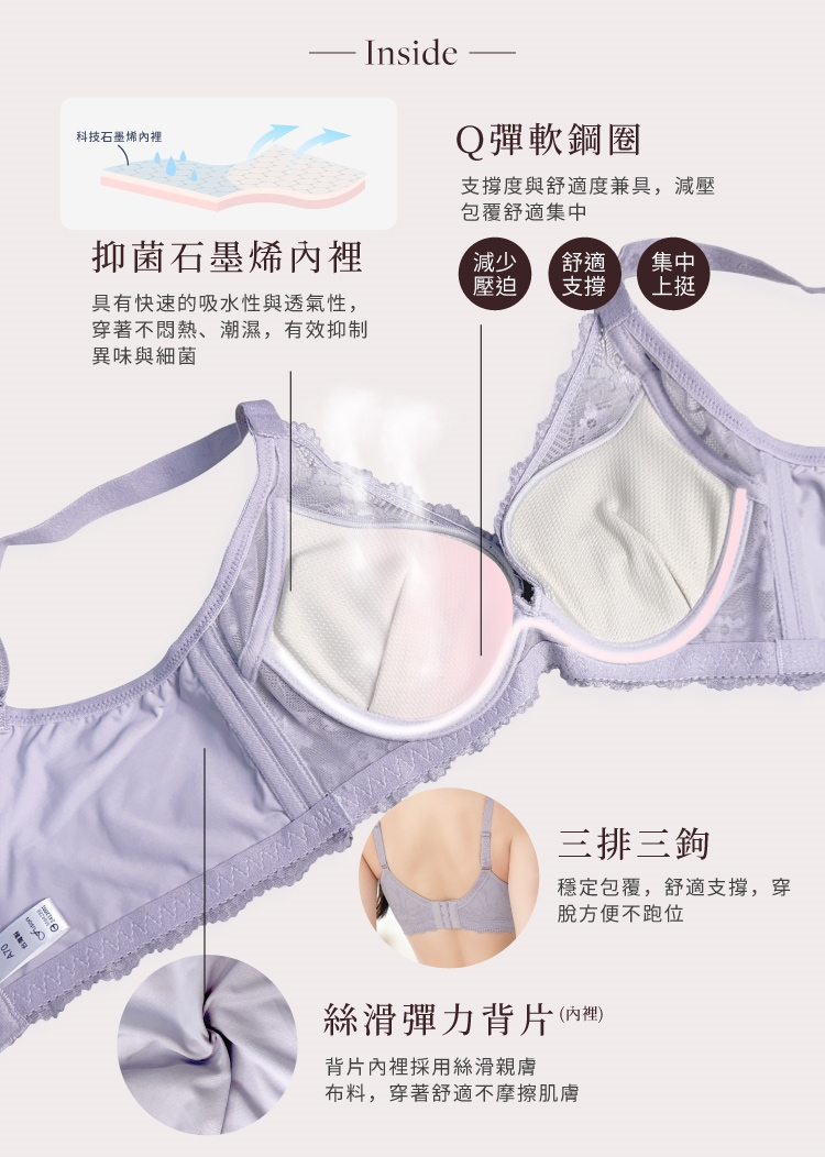 採用Q彈軟鋼圈,提供適度支撐,貼合胸型