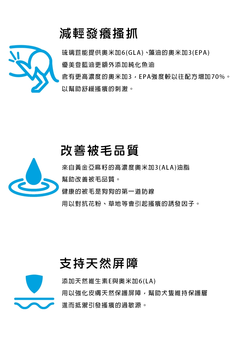 針對搔癢的犬隻所開發的高品質保健營養品,正確比例的奧米加3與6油脂可幫助皮膚健康。採用獨特配方,混和最純淨、有效的頂級冷壓油。