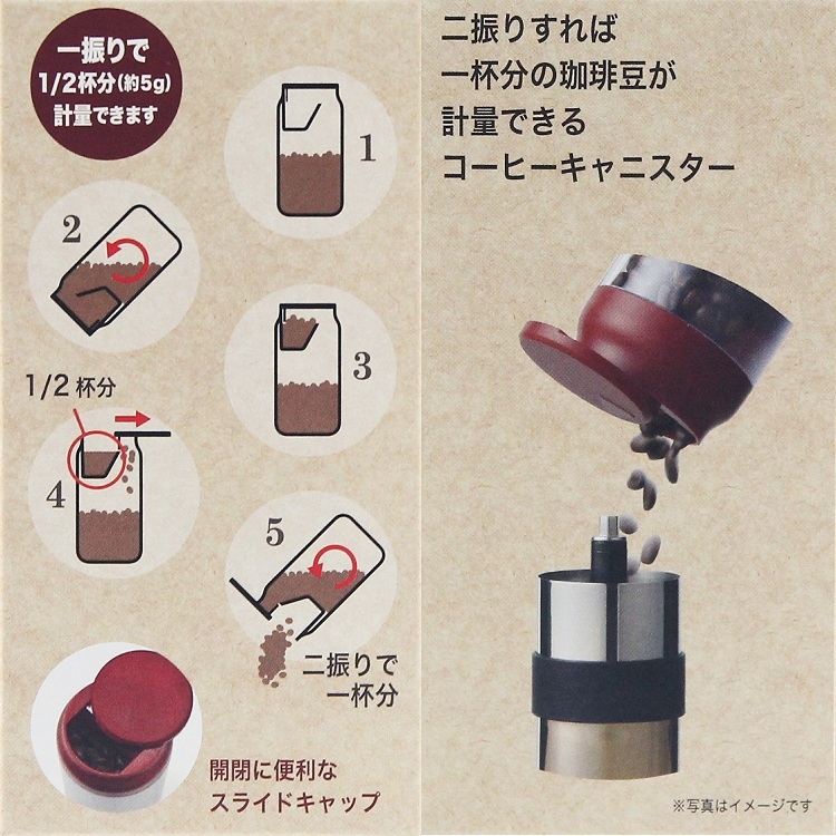 - 蓋上蓋子並傾斜後,即可量出約 5 克咖啡豆,然後將罐子插入咖啡研磨機兩次,即可研磨一份咖啡豆(共 10 克)。