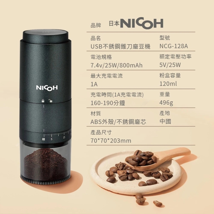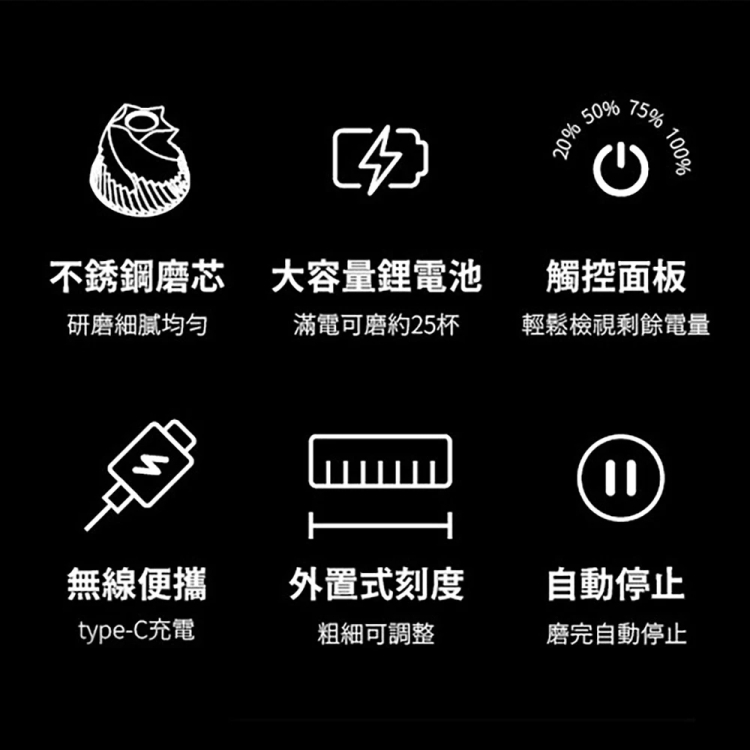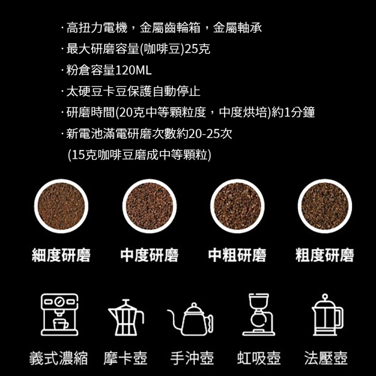 - 滿電研磨次數(15克咖啡豆磨成中等顆粒)20-25次