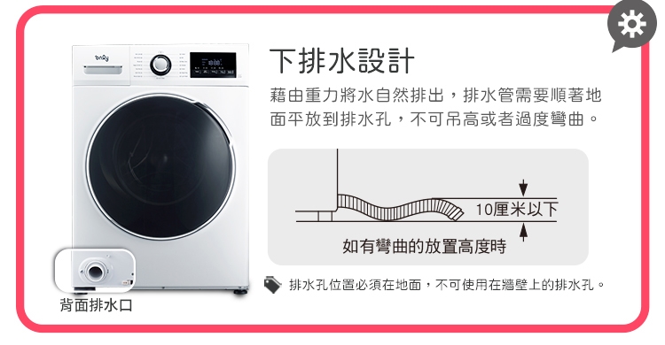 藉由重力將水自然排出,排水管需要順著地面平放到排水孔,不可吊高或者過度彎曲。(排水孔位置須在地面,不可使用牆上排水孔)