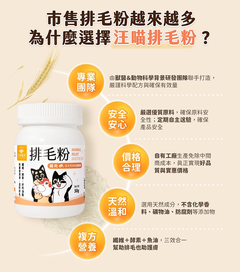 A4.汪喵星球排毛粉成分為天然纖維與消化酵素、天然魚油&亞麻仁油,可幫助維持腸道健康及幫助糞便潤滑。雖然狗狗沒有頻繁舔毛的習性,但若玩耍時食入大量毛髮,還是可以補充排毛粉來幫助排除毛髮及幫助腸胃蠕動喔。