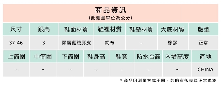 2.鞋類商品依功能及用途之不同,鞋底各有其止滑係數之個別不同,使用鞋類商品請用於正常平坦之路面,非雨鞋或雨靴類商品,請避免穿著於下雨濕滑路面上行走。