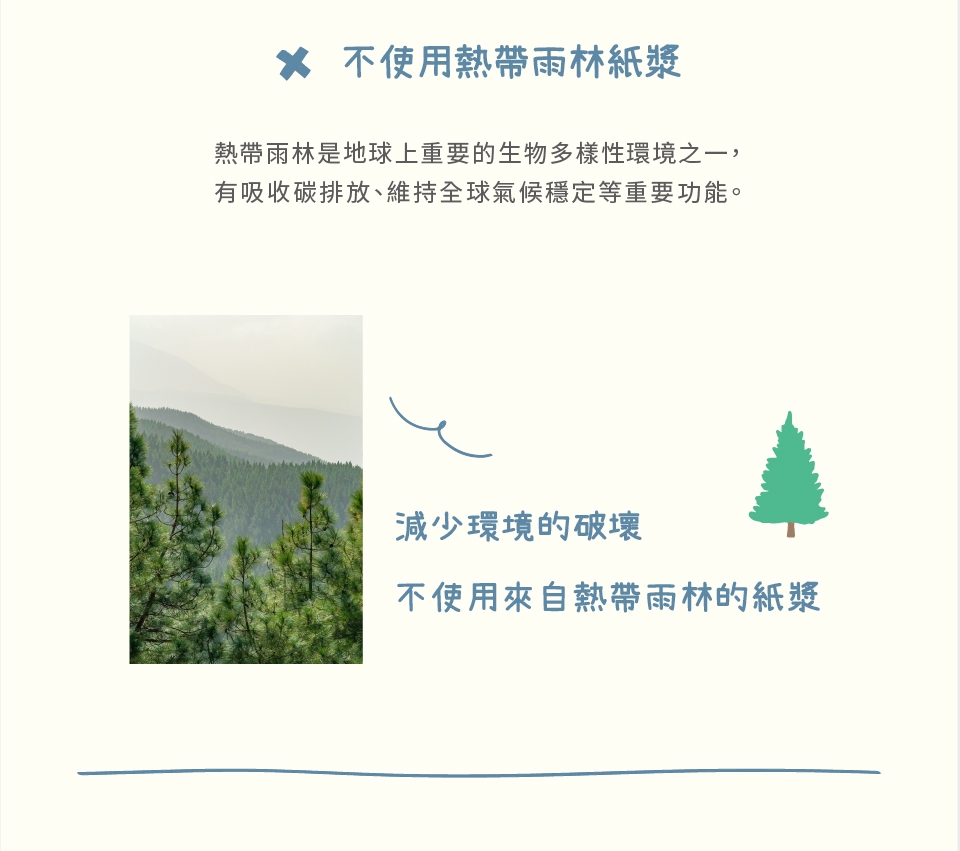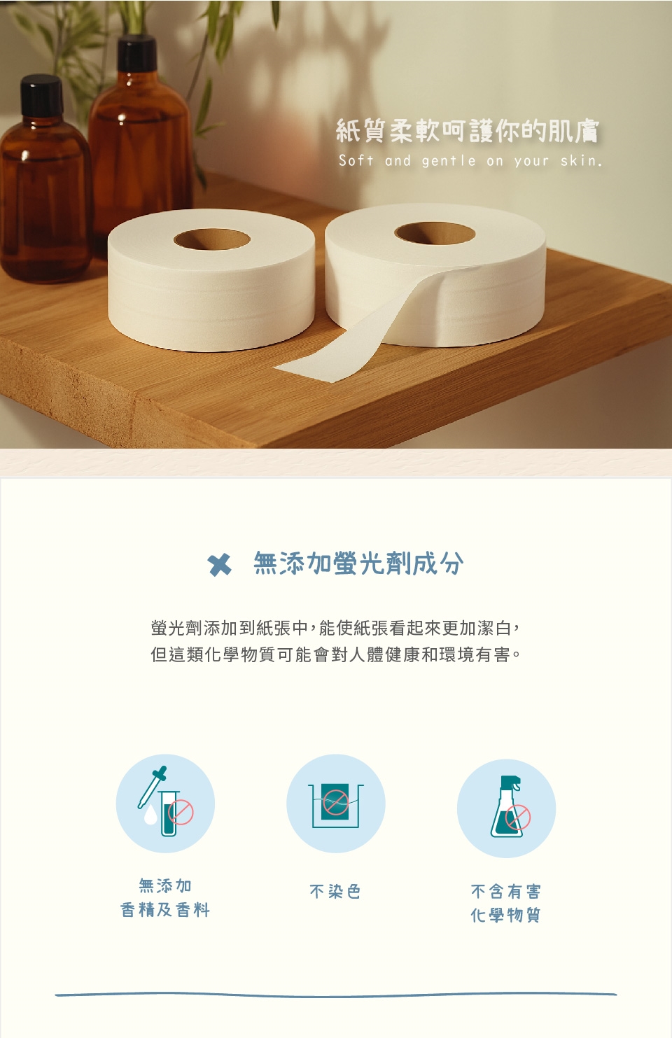 環保紙漿材質衛生紙,不含有害化學物質、無添加螢光劑,堅持不使用熱帶雨林紙漿成分,紙質柔軟觸感升級,