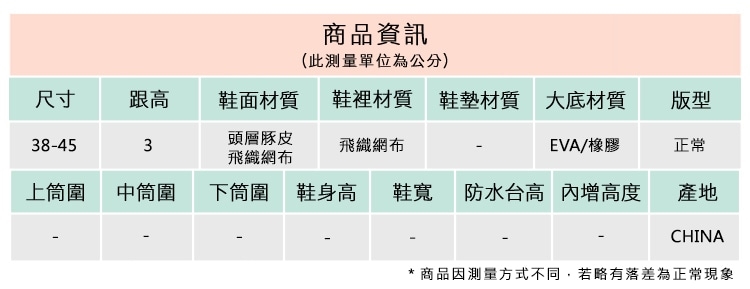 2.鞋類商品依功能及用途之不同,鞋底各有其止滑係數之個別不同,使用鞋類商品請用於正常平坦之路面,非雨鞋或雨靴類商品,請避免穿著於下雨濕滑路面上行走。