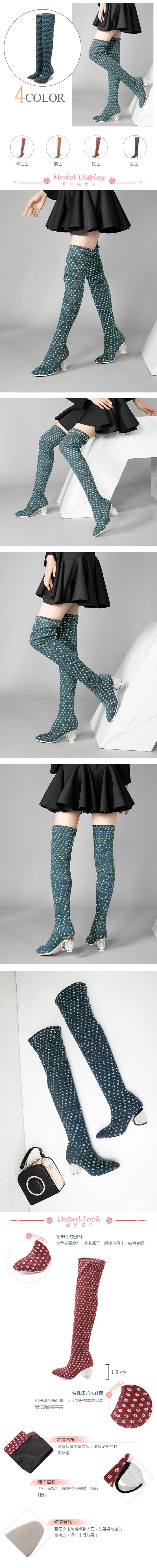 【KISSXXX】印花異形跟彈力過膝長靴/復古印花水晶珠異形跟彈力過膝長靴 女鞋 藍
