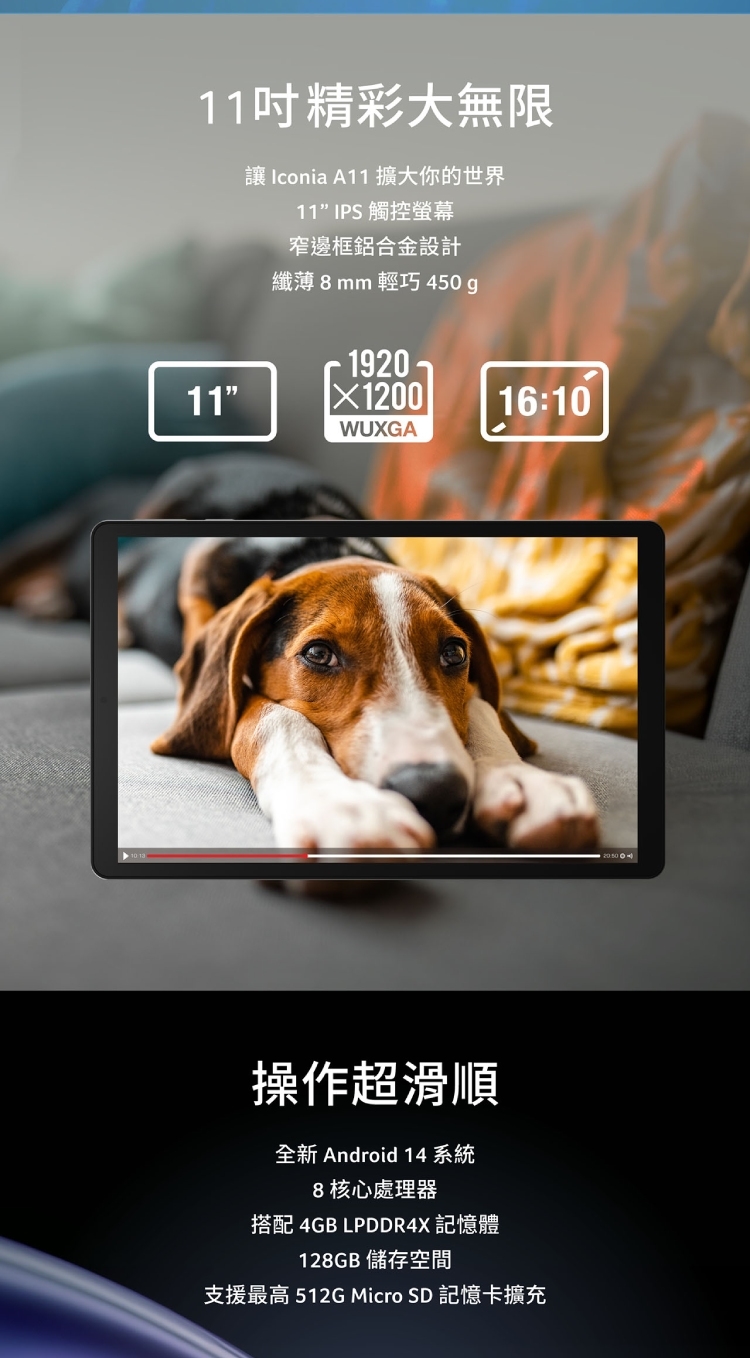 ◆ 11吋(16:10)IPS WUXGA螢幕