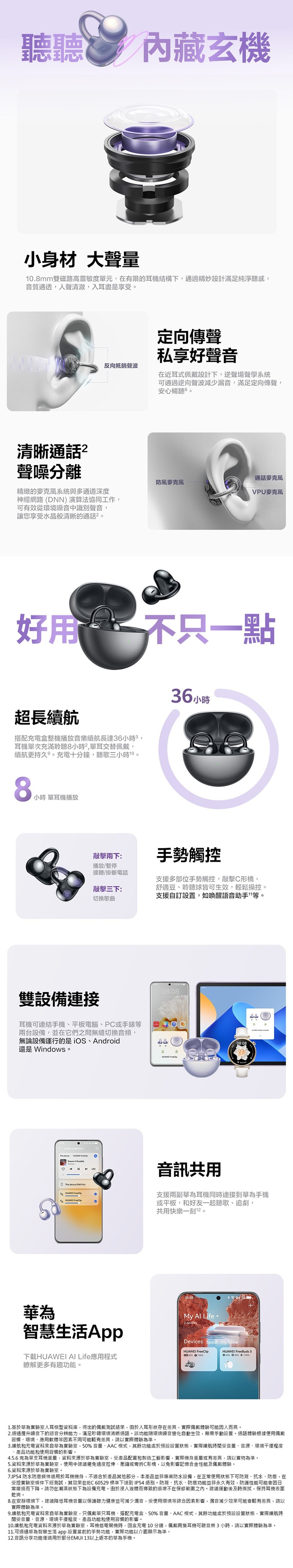 *續航力和充電數據來自華為實驗室測試。 測試期間,AAC 格式的音訊以 50% 的音量播放。 其他功能使用預設設定。 實際結果可能會因音量、音源、環境干擾、產品功能和使用習慣而有所不同。