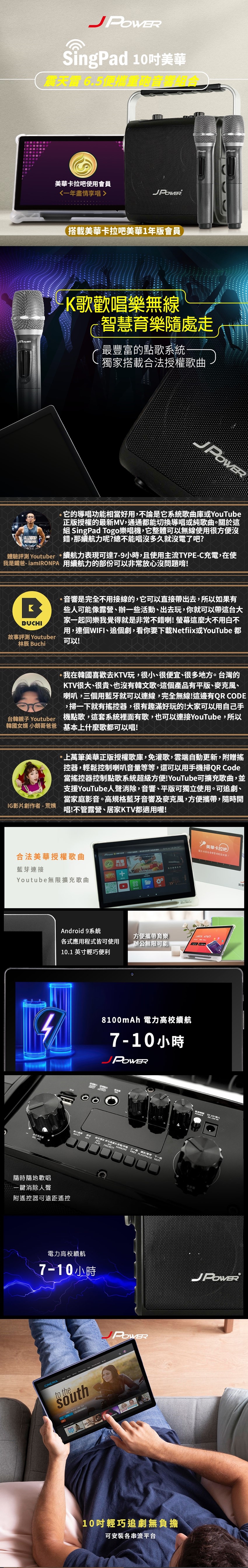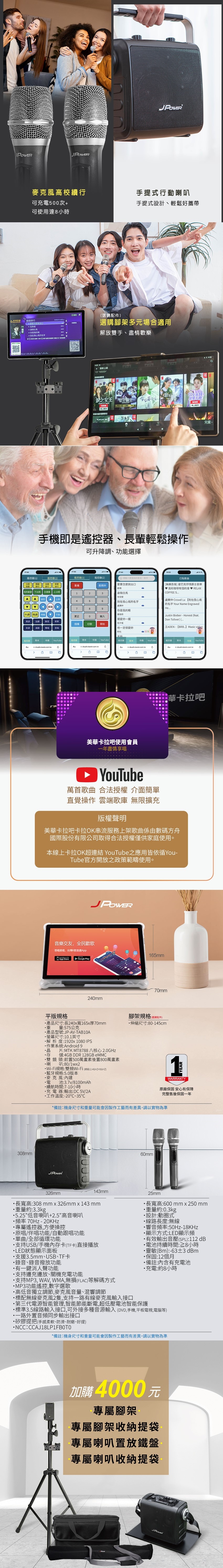 JPOWER 杰強 SingPAD樂唱機震天雷(美華平板 1年版序號6.5便攜無線藍牙KTV音響組合)(編號:JP-AV-TAB10A/KS-Tab156MA)
