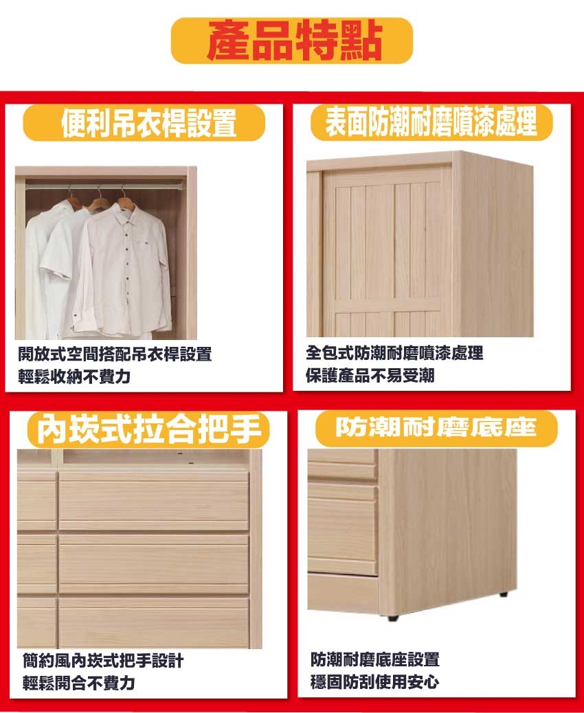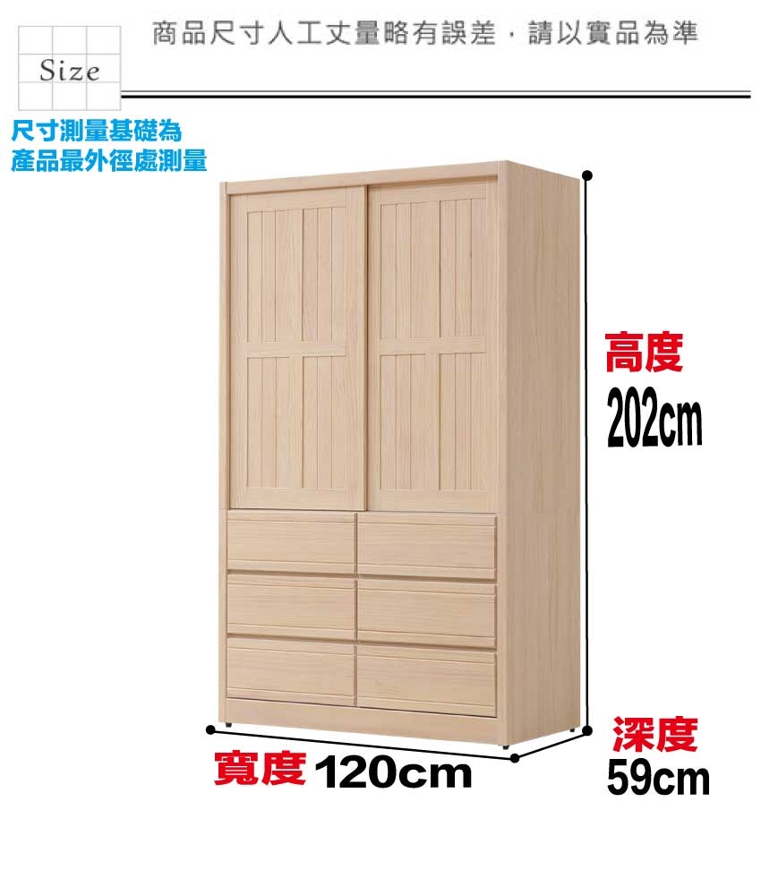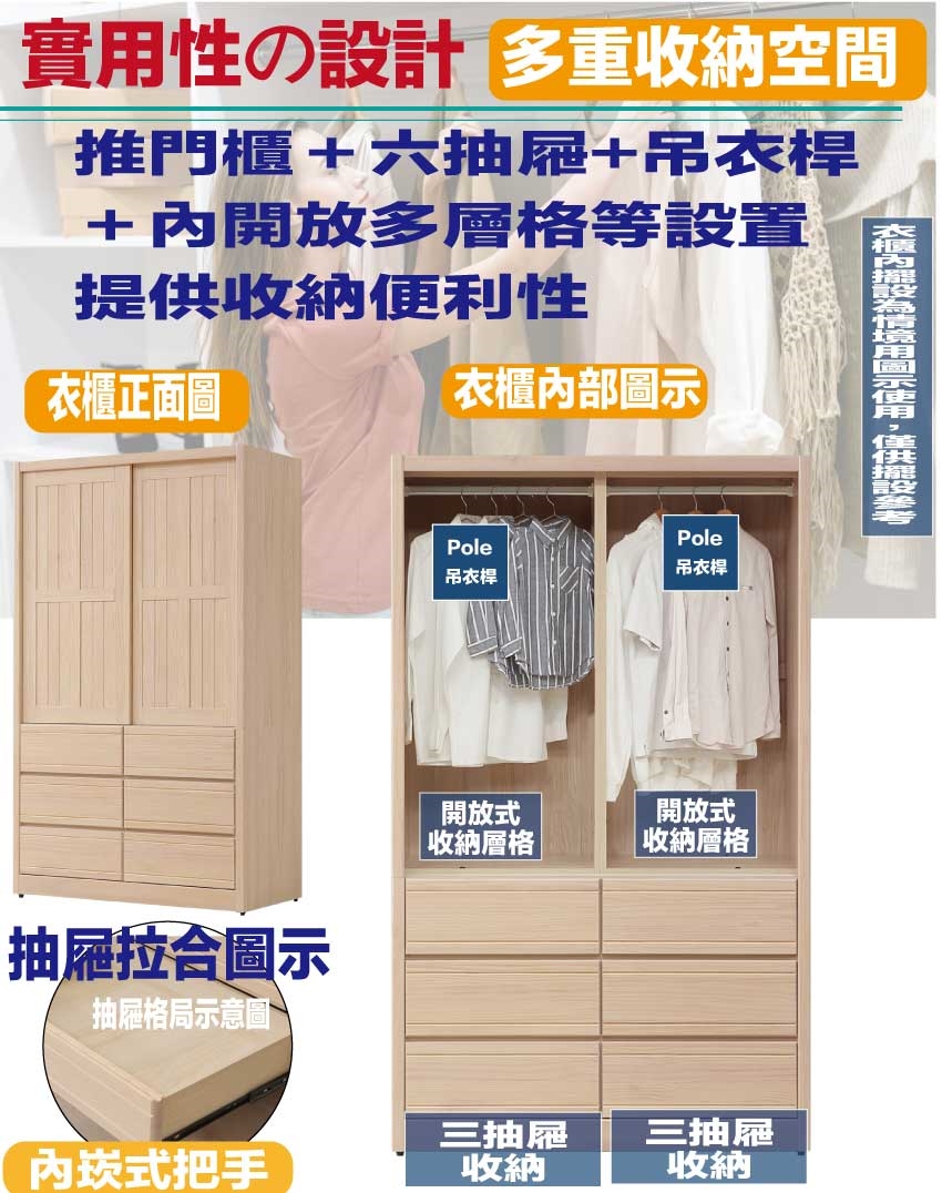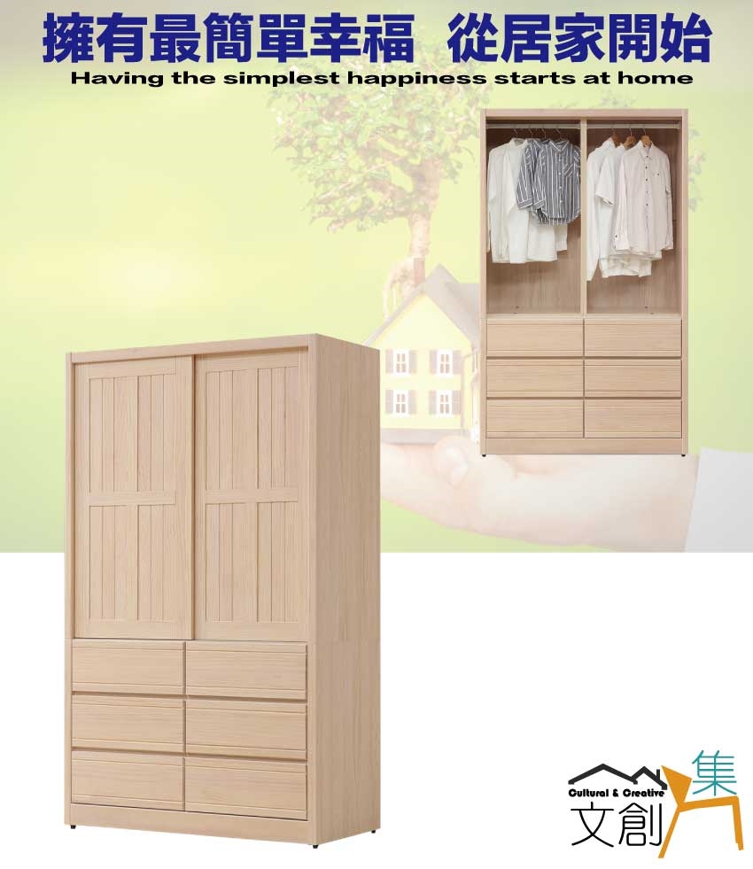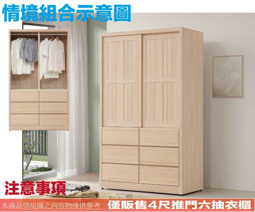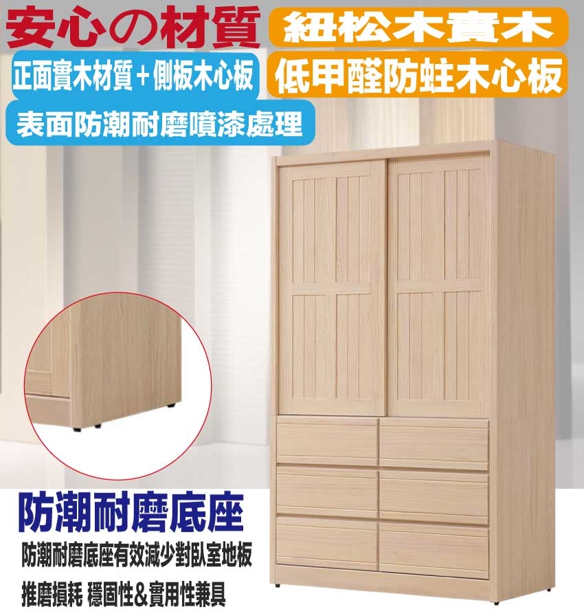 【文創集】希望4尺實木推門六抽衣櫃   洗白木紋色系+安心材質製造,使用放心+搭配居家更便利,採用紐松木實木+防蛀木心板+實木防磨底座+五金滑軌結構等安心材質製造 ,外層採用防潮耐磨噴漆處理搭配採用推門櫃+吊衣桿+六抽屜+內開放層格等收納空間設計,全由專人配送到家,專業安心服務,替你省下更多時間!