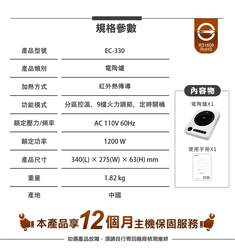 ●電熱管 + 陶瓷面板,無有害輻射