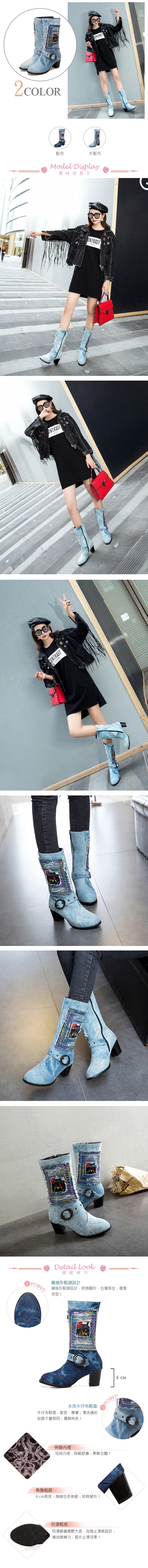 【KISSXXX】皮帶釦粗跟牛仔中筒靴/文藝復古風嬉皮拼接皮帶釦飾粗跟牛仔中筒靴 女鞋 水藍