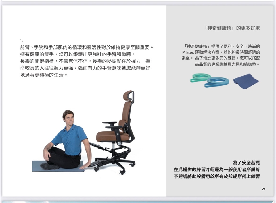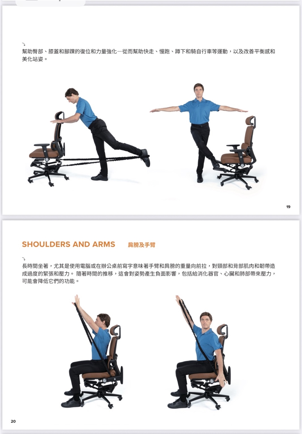 健康椅內建多組彈力繩與雙腳踏板,可執行上肢、下肢及核心訓練。