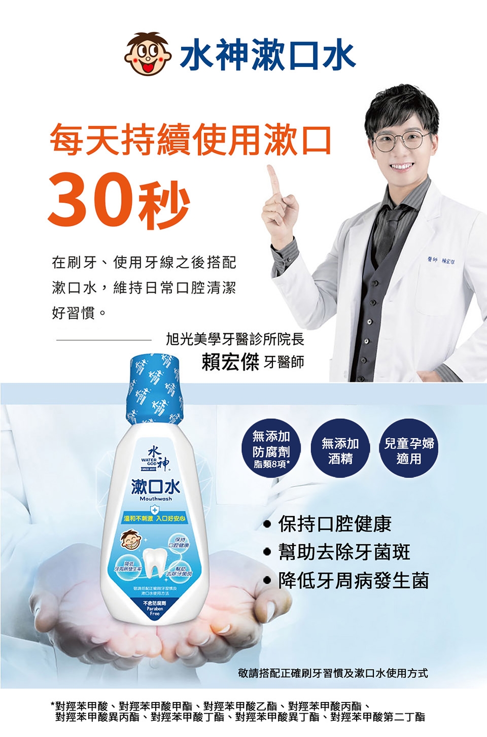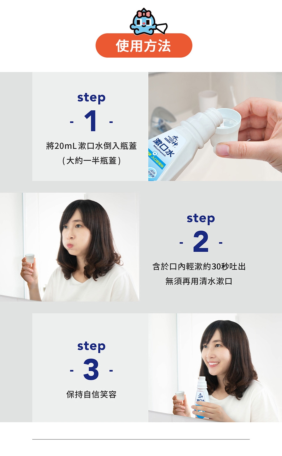 將20ml漱口水倒於瓶蓋(大約一半瓶蓋)含於口內輕漱約30秒後吐出,無需再用清水漱口