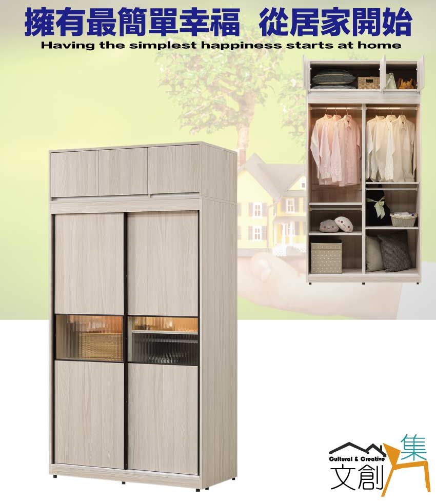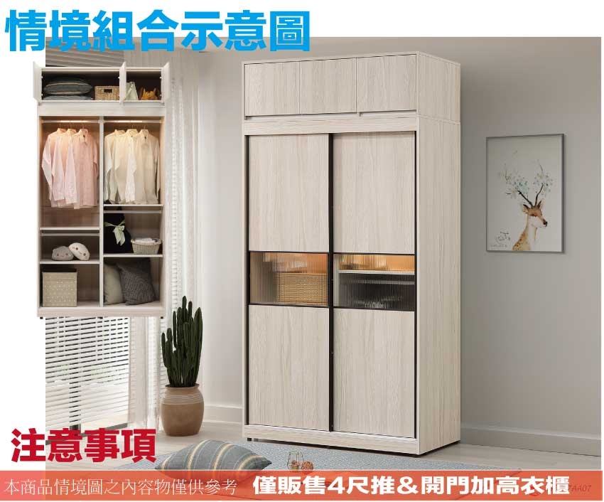 【文創集】希望4尺開&推門加高衣櫃組合 淺橡木紋色系+安心材質製造,使用放心+搭配居家更便利,採用防蛀木心板+防潮耐磨底座+防夾手緩衝門片五金+5mm直紋強化玻璃等安心材質製造 ,外層採用防潮耐磨噴漆處理搭配採用開門櫃&推門櫃+吊衣桿+內開放層格等收納空間設計,全由專人配送到家,專業安心服務,替你省下更多時間!