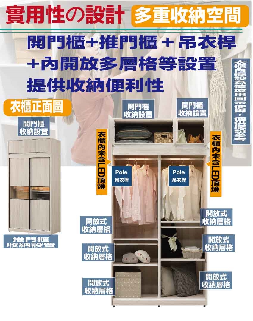 搭配採用開門櫃&推門櫃+吊衣桿+內開放層格等收納空間設計