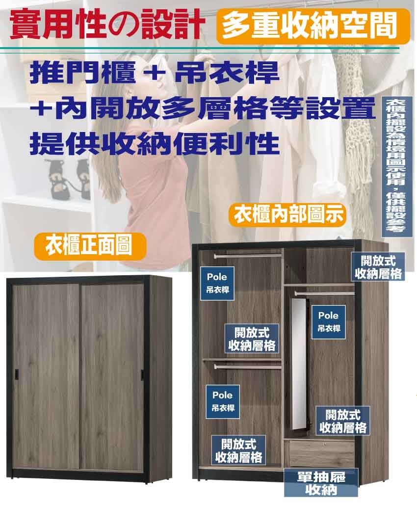 搭配推門櫃+吊衣桿+單抽屜+內開放式層格+內含側拉鏡面等收納空間設計