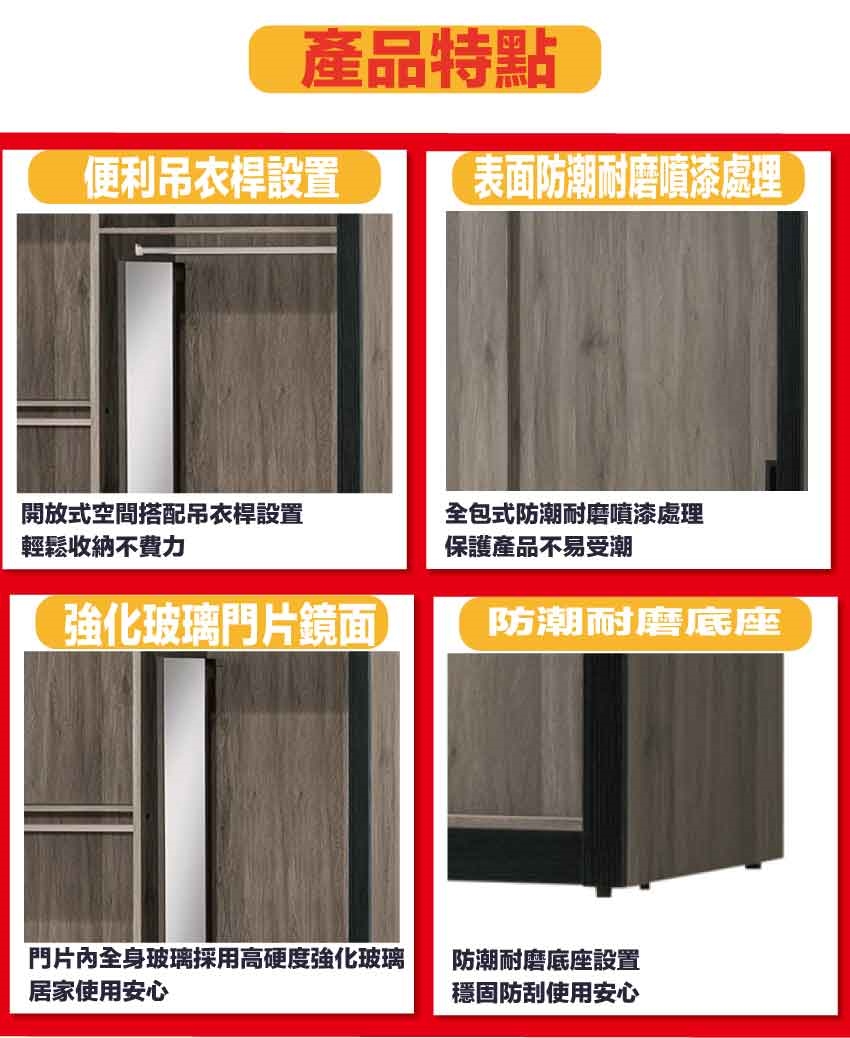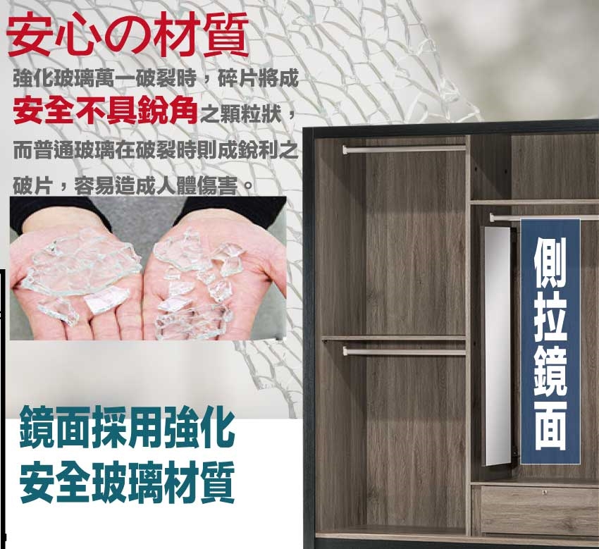 採用防蛀木心板+防潮耐磨底座+強化玻璃鏡面等安心材質製造
