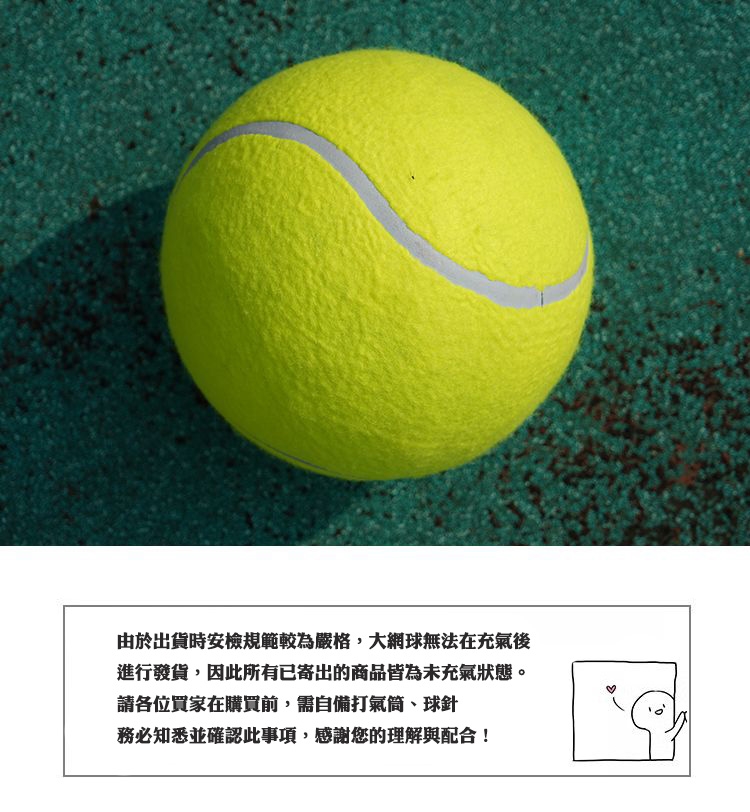 ※由於出貨時安檢規範較為嚴格,大網球無法在充氣後進行出貨,因此所有已寄出的商品皆為未充氣狀態。