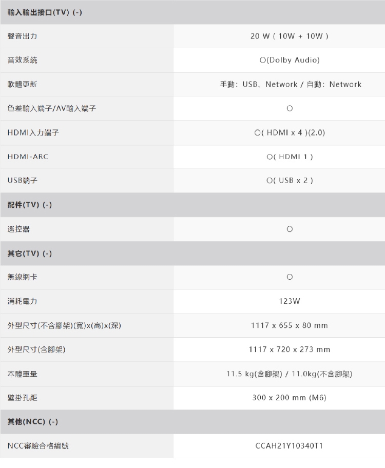 外型尺寸(不含腳架)(寬)x(高)x(深):1117 x 655 x 80 mm