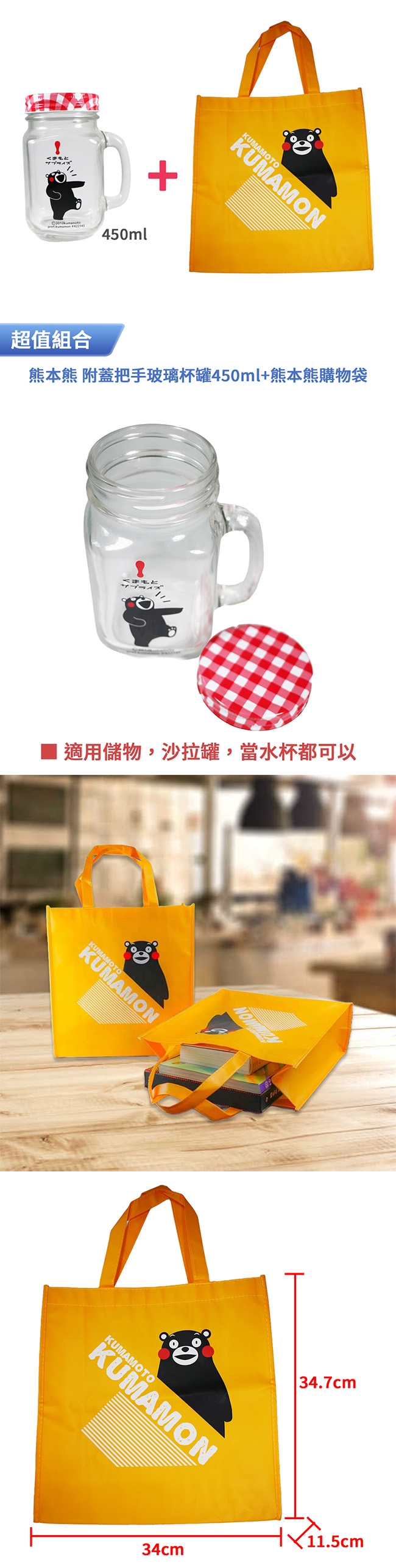 熊本熊 附蓋把手玻璃杯罐450ml KM450-1+KUMAMON熊本熊購物袋 Q-01K 單入
