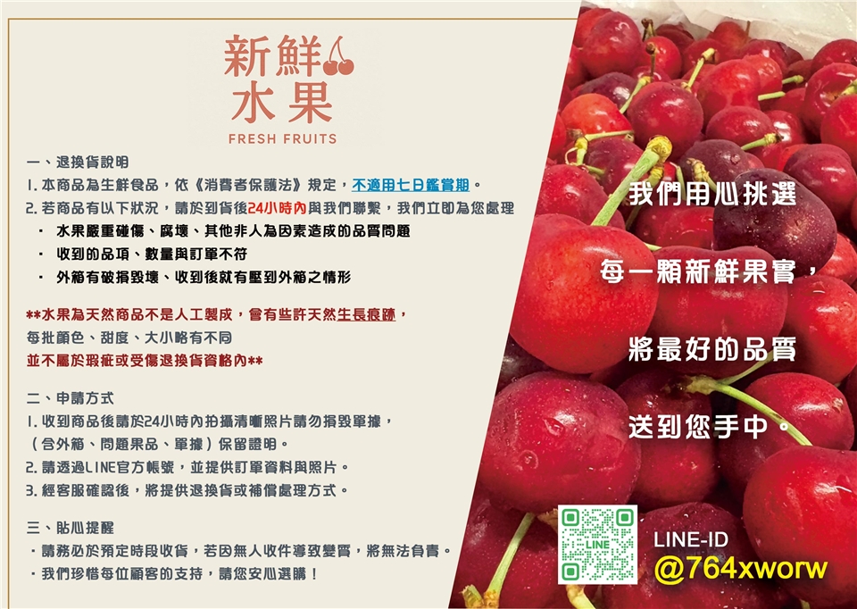 我們用心挑選每一顆新鮮果實,將最好的品質送到您手中。為保障您的權益,請詳閱以下退換貨說明: