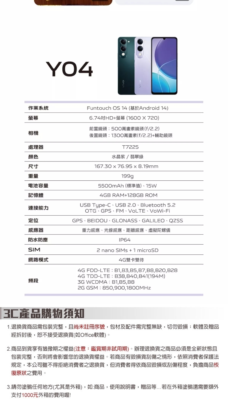 ◎ 型號:VIVO Y04 (4G)4G/128G