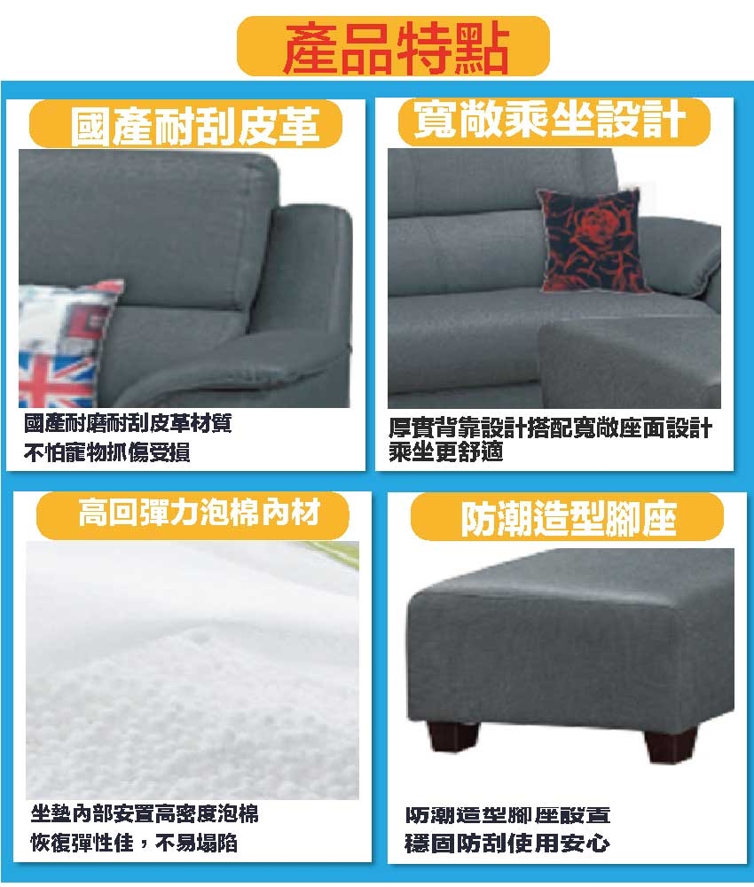 採用內部實木板材框架+防潮造型腳座+耐刮耐磨皮革+高回彈力加厚泡棉等安心材質製造
