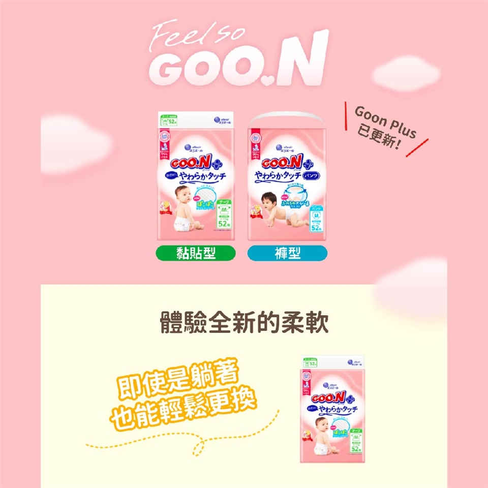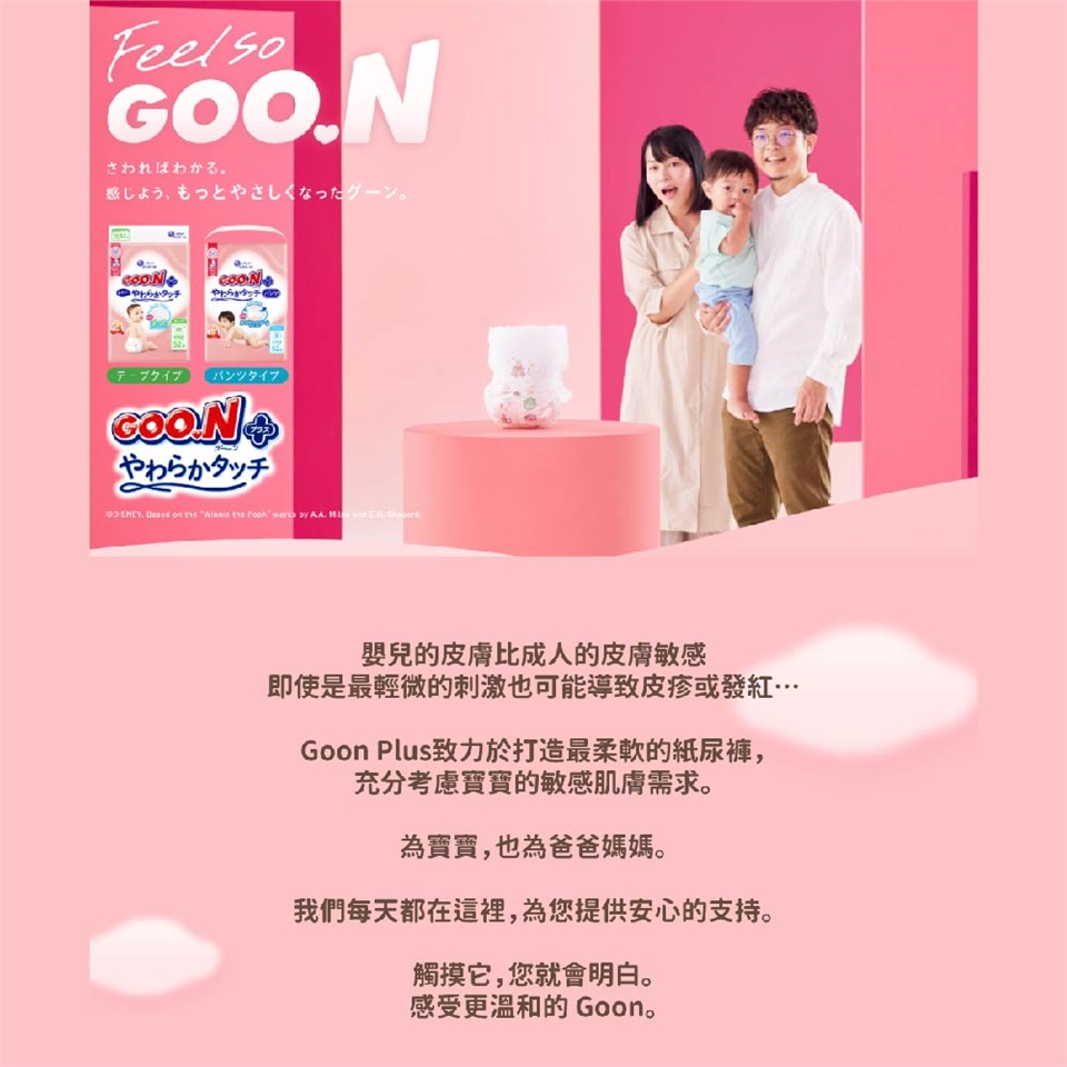 Goon Plus致力於打造最柔軟的紙尿褲,充分考量寶寶的敏感肌需求。