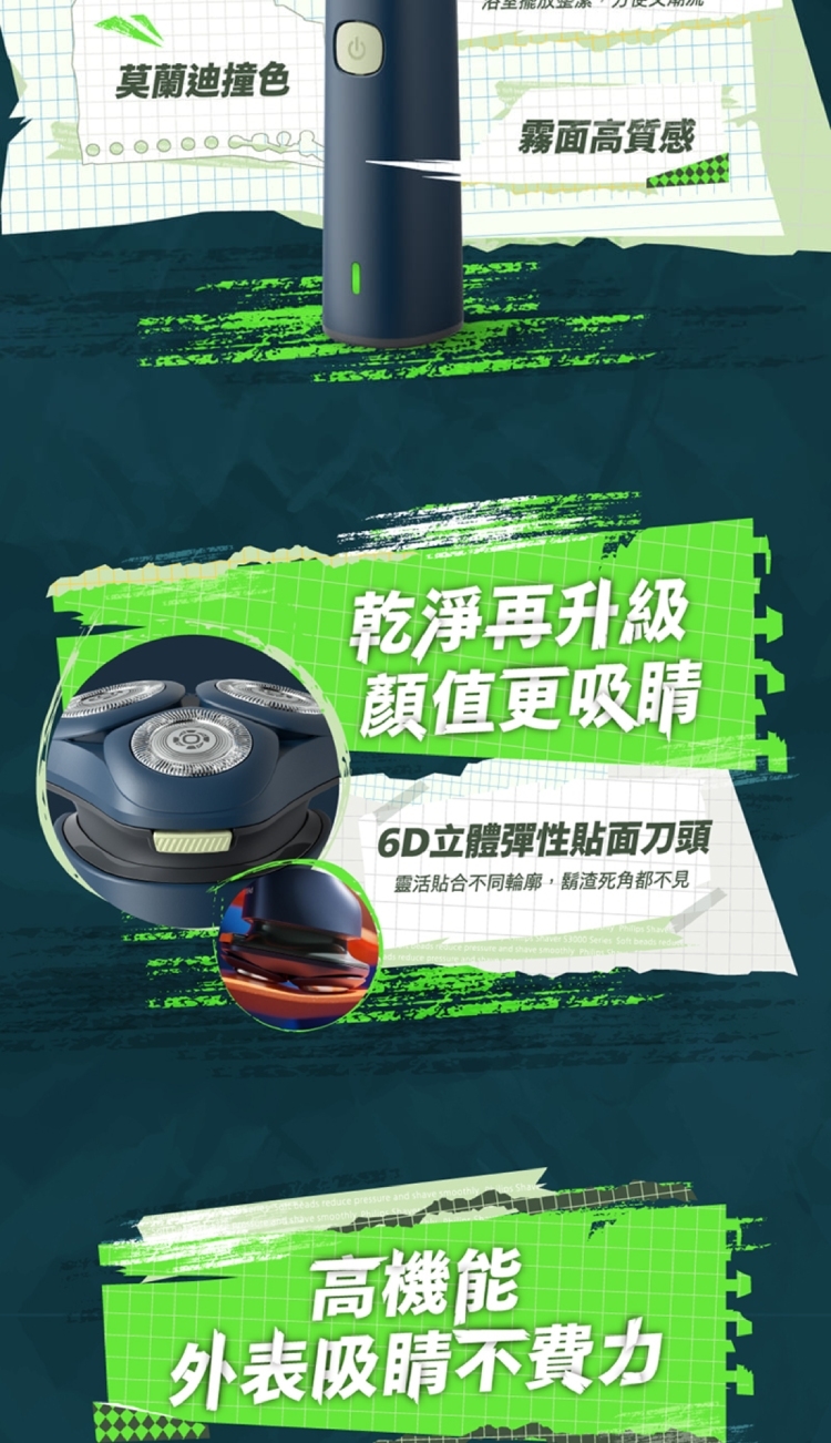 ◆ 靈活貼合:6D立體彈性貼面刀頭,貼合各種輪廓,鬍渣死角都不見