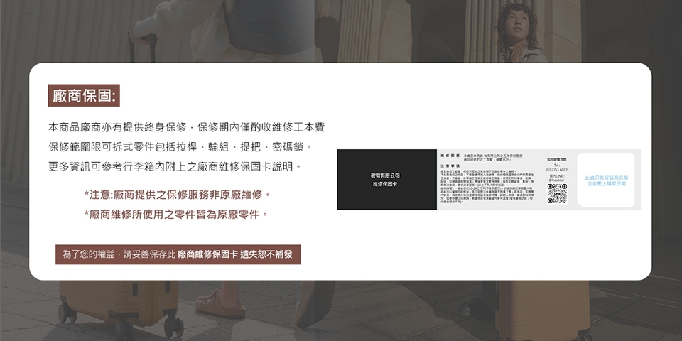*請注意,旅行箱的內襯屬於易撕設計,以便原廠處理後續維修事宜,因內襯為手工黏合,原廠出廠偶有發生內襯脫落之情形,但並非商品瑕疵,如遇內襯不慎脫落之情形,將之黏回原處即可。