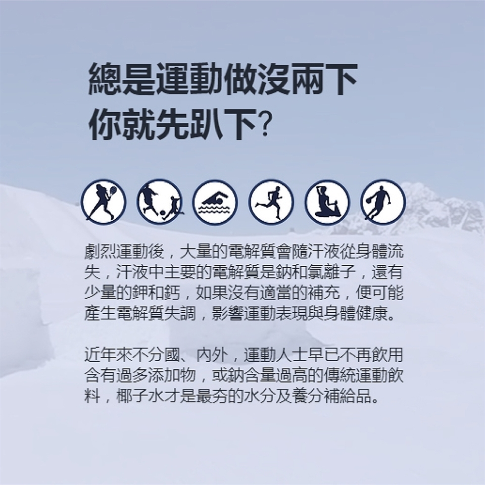▲未開封前,液面上所形成的白色環狀物、底部沉澱或細小褐點,為椰子水中的天然油脂,與其他微量成分如胺基酸自然聚集而成,請搖勻後安心飲用,開封後請冷藏,並盡速飲用完畢。