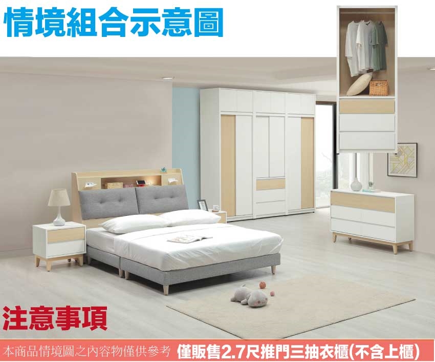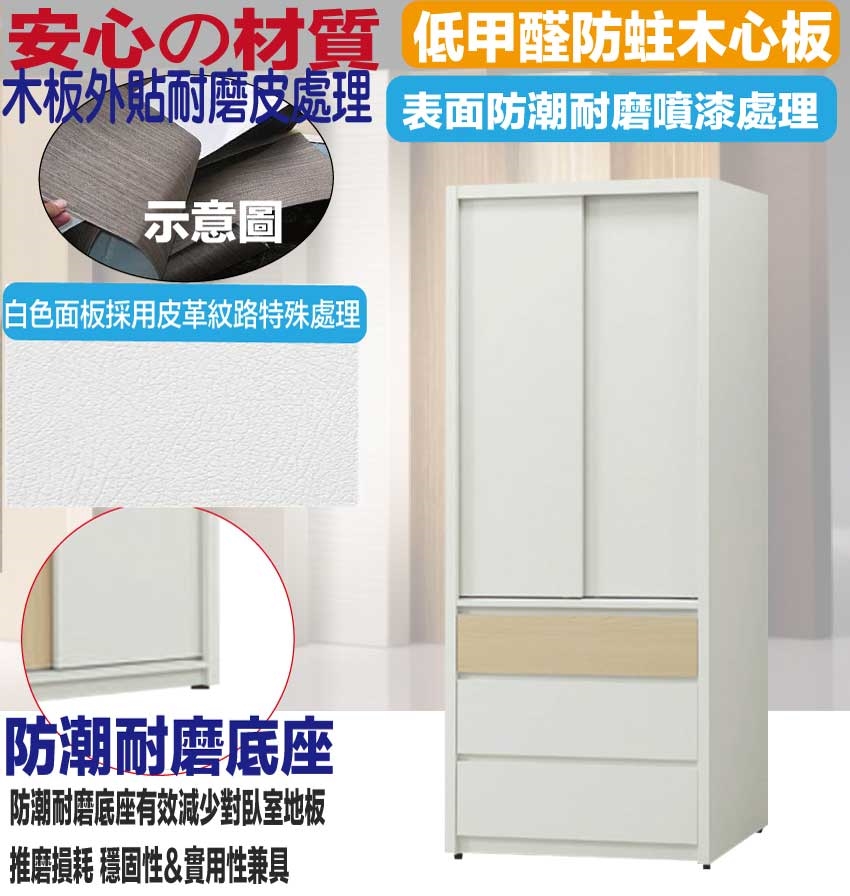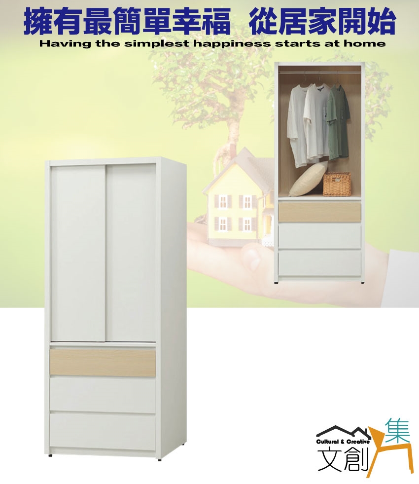 【文創集】歐瑞雙色2.7尺推門三抽衣櫃 木紋雙色系+安心材質製造,使用放心+搭配居家更便利,採用防蛀木心板+防潮耐磨底座+五金滑軌結構+白色面板外層採用皮革紋路特殊處理等安心材質製造 ,外層採用防潮耐磨噴漆處理搭配採用推門櫃+吊衣桿+三抽屜+內開放層格等收納空間設計,全由專人配送到家,專業安心服務,替你省下更多時間!