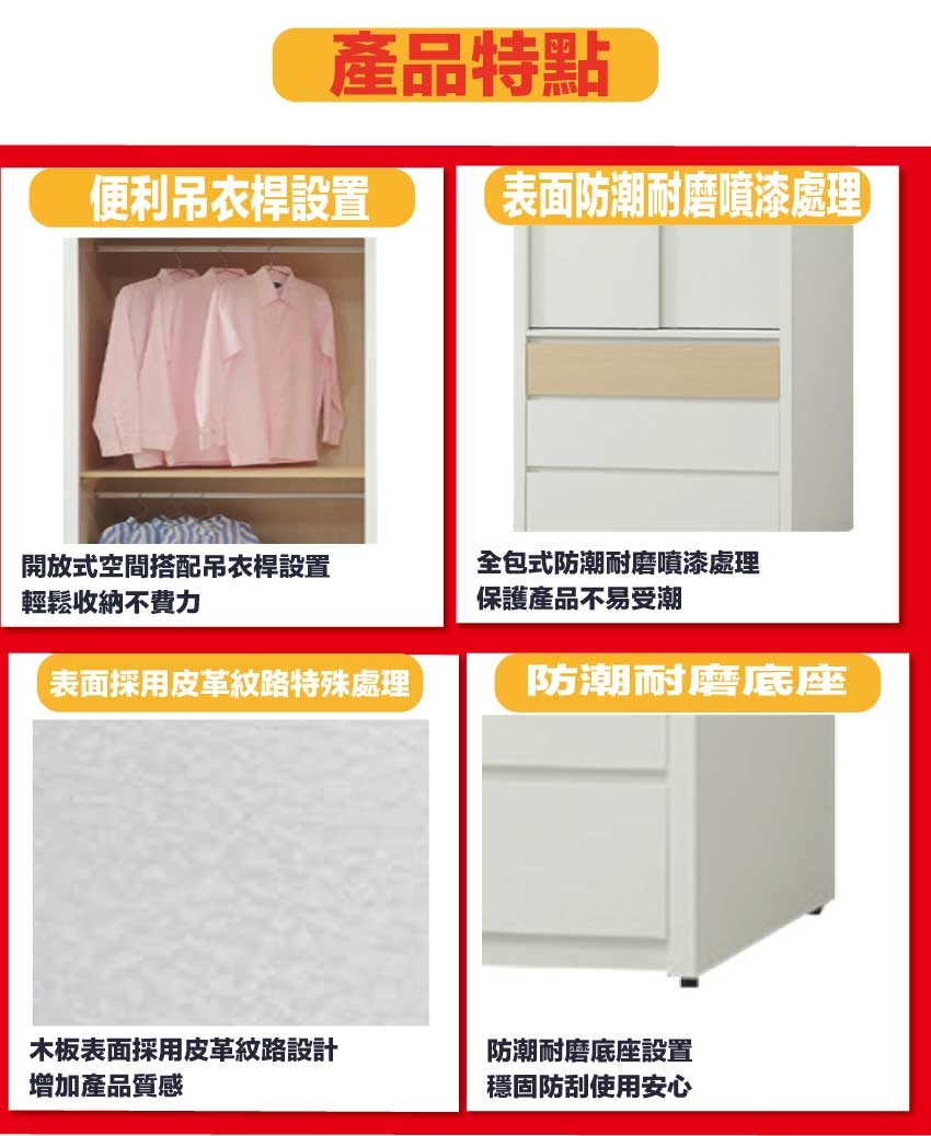 採用防蛀木心板+防潮耐磨底座+五金滑軌結構+白色面板外層採用皮革紋路特殊處理等安心材質製造