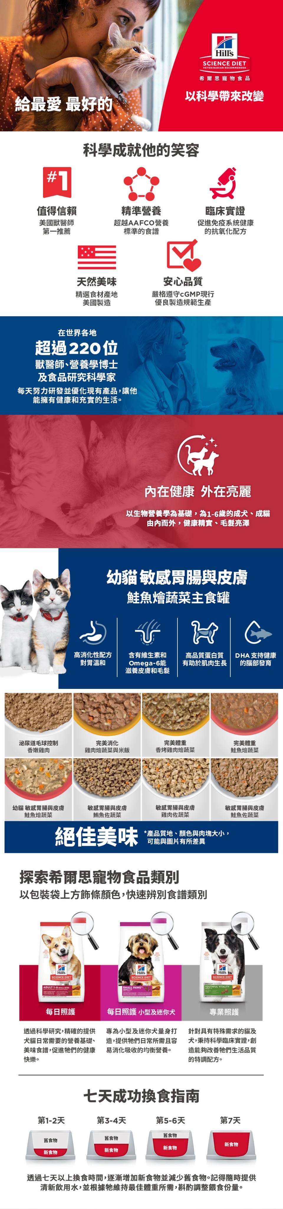 請見產品外包裝以取得詳細的餵食指南,視寵物維持最佳體重所需,斟酌調整餵食量,若不確定,可向獸醫師諮詢。若首次餵食本產品,請以七天以上時間轉換餵食,逐漸增加新食物並減少舊食物。請隨時提供清新飲用水!寵物的營養需求會隨著年齡增長而改變,請於寵物健檢時諮詢醫師相關資訊。