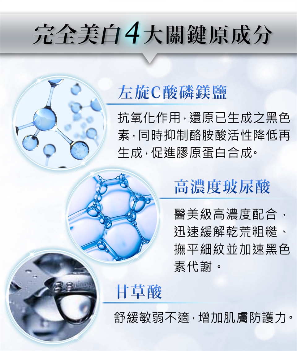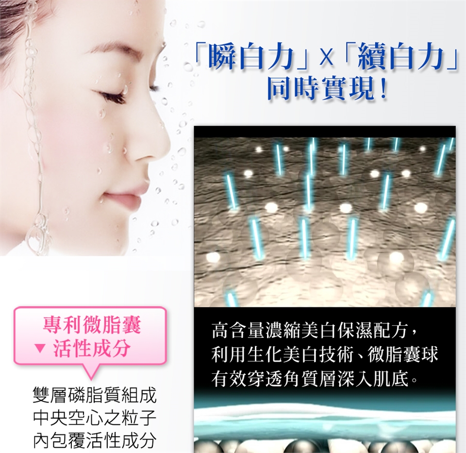 ‧美白液:清潔臉部肌膚後,取適量塗抹於全臉,並可加強兩頰及色素易沉澱處。
