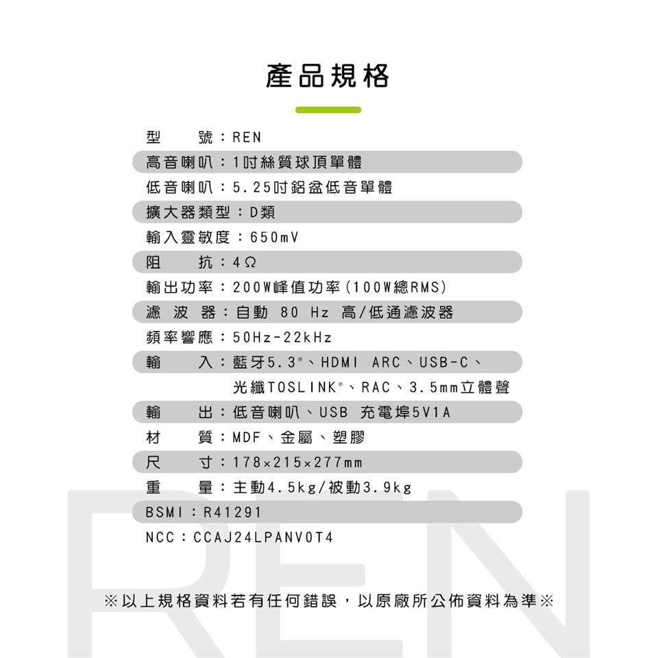 REN提供多種連接選擇,包括HDMI ARC附CEC、RCA、藍牙5.3附AAC、數位光纖和USB-C等音訊輸入方式。
