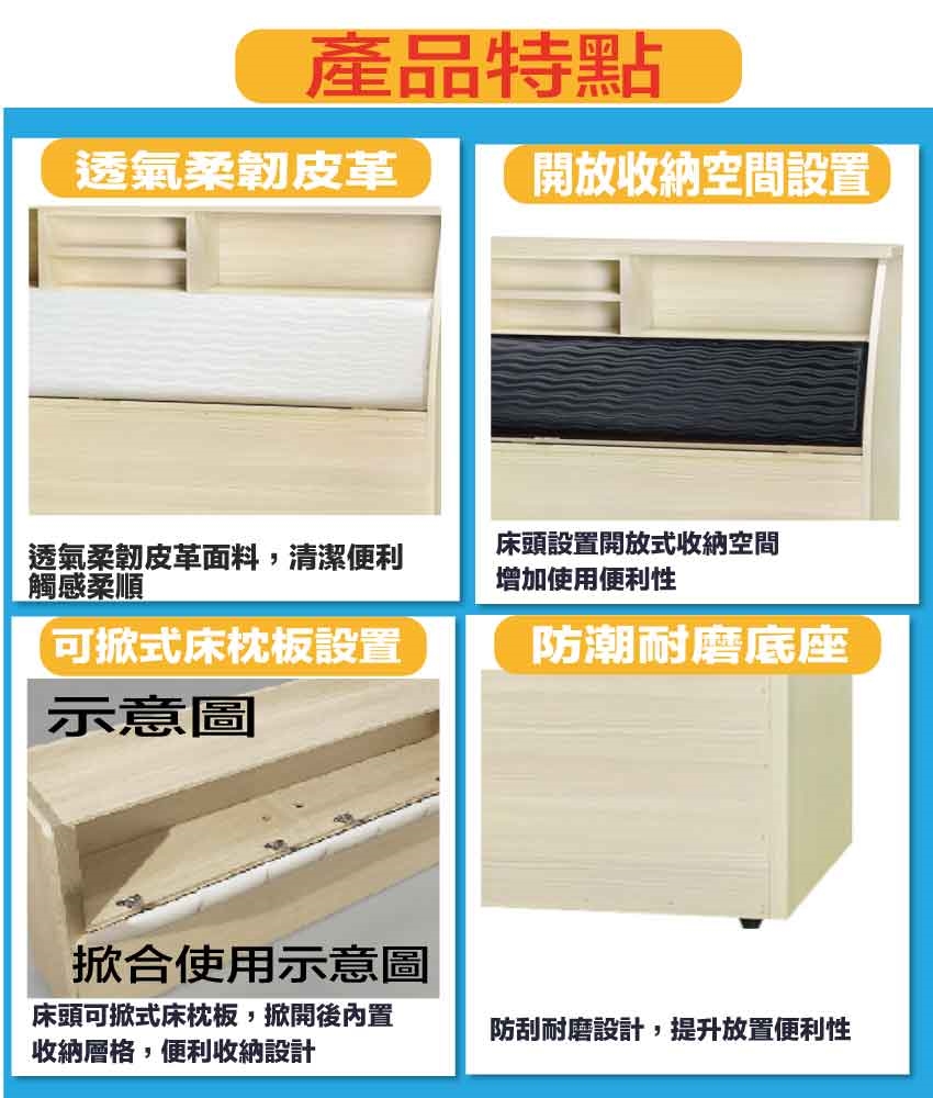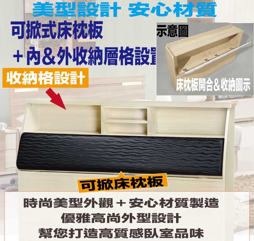 搭配床頭採用可掀式床枕板+內&外收納空間等收納空間設計