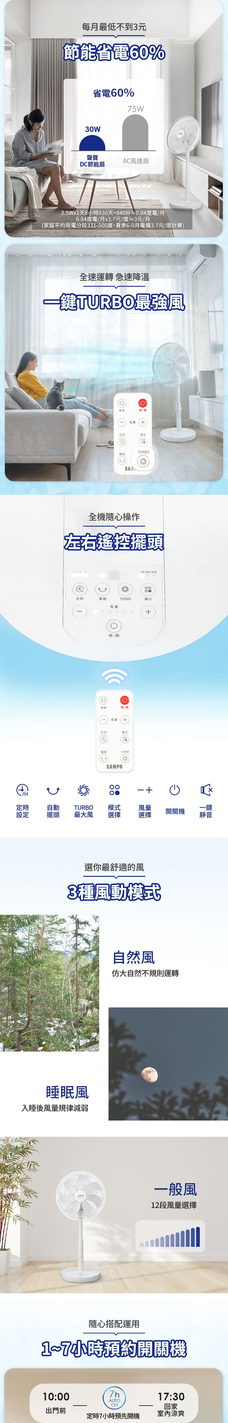◆7段風量+3種模式(一般風、自然風、舒眠風),自由設定。