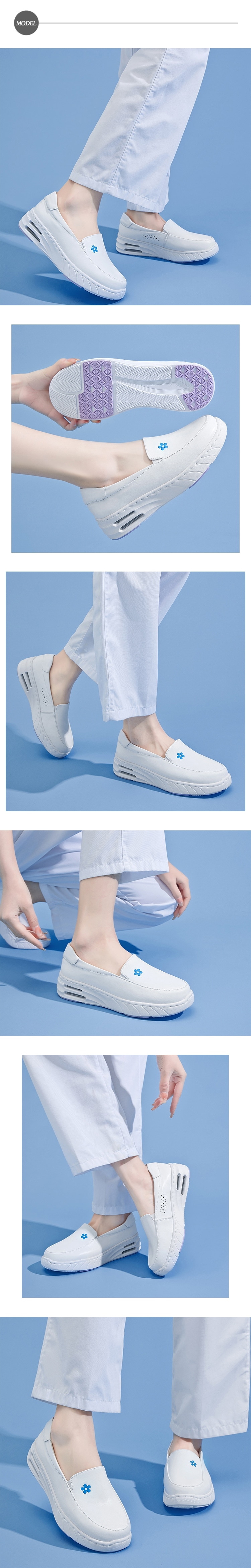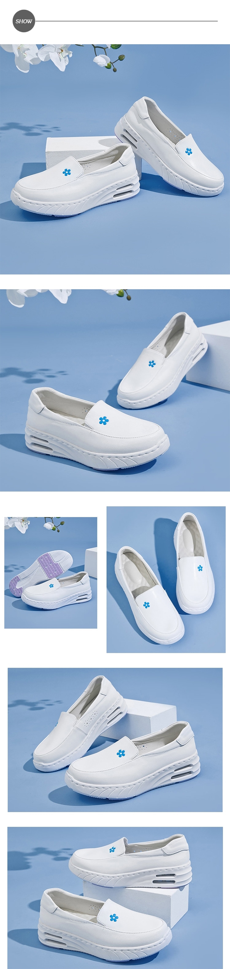 【MOM】真皮彈力氣墊護士鞋/真皮可愛藍色小花彈力舒適氣墊樂福鞋 護士鞋 女鞋 白