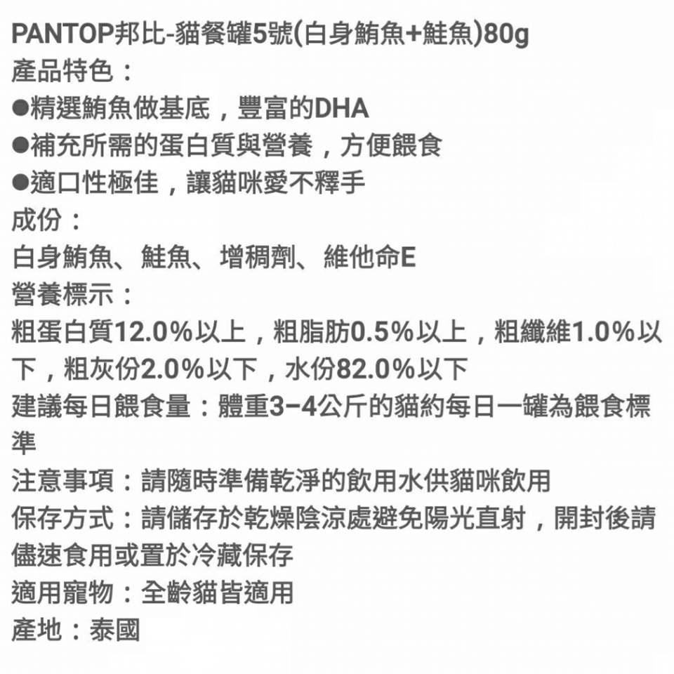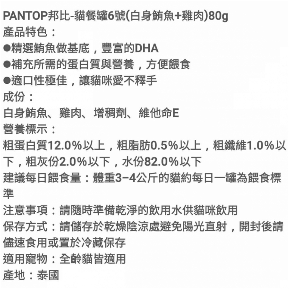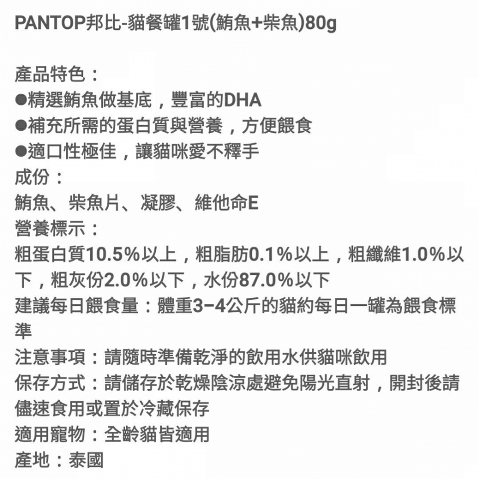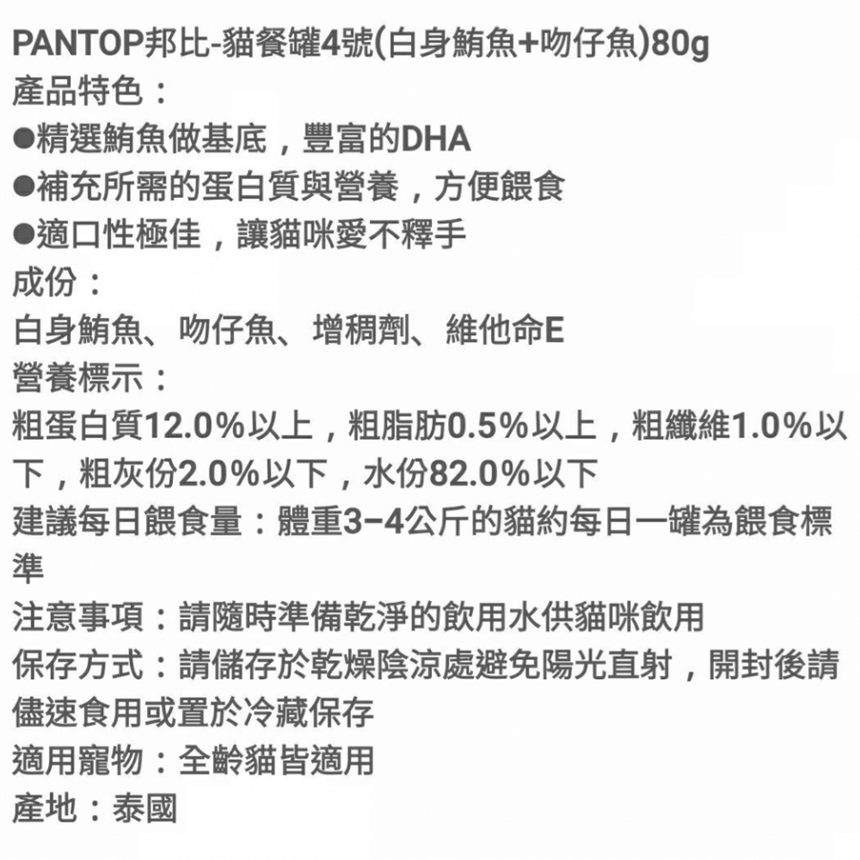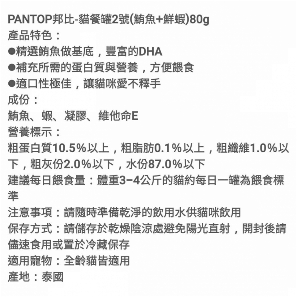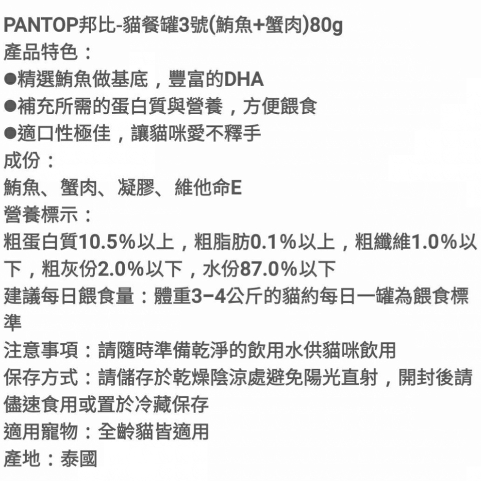 每日建議餵食量:3~4公斤成貓,每餐1罐,每日兩餐(請依實際狀況餵食:如健