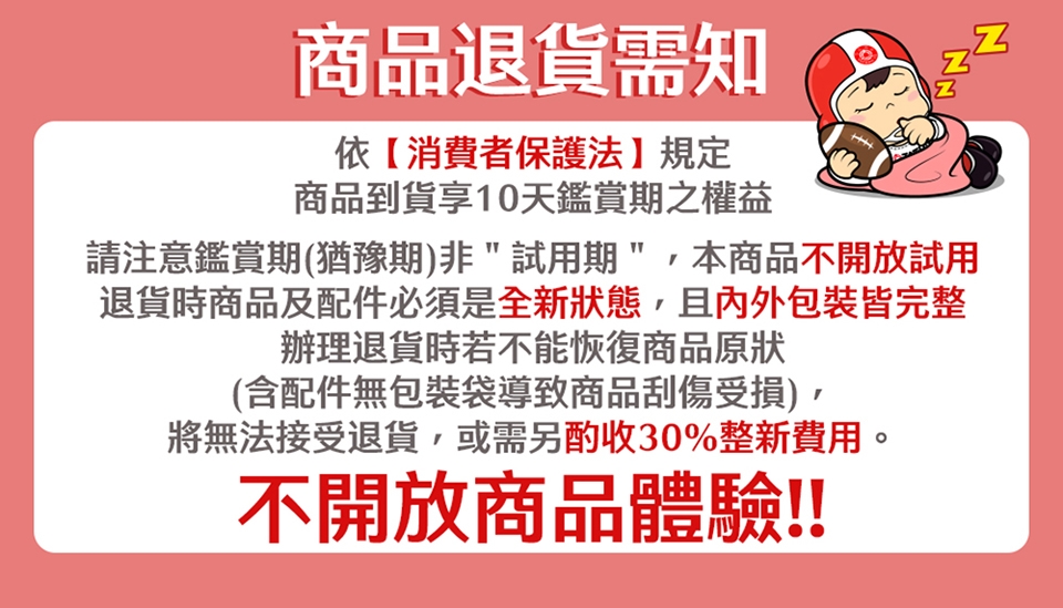 依據消費者保護法的規定,您享有商品貨到日起7天猶豫期解約退貨之權益。但提醒您,猶豫期並非試用期,除為檢查商品所必要外,您所退回的商品必須保持您收到商品時的原始狀態(包含主商品、配件、內外包裝、隨機文件、贈品…等)。