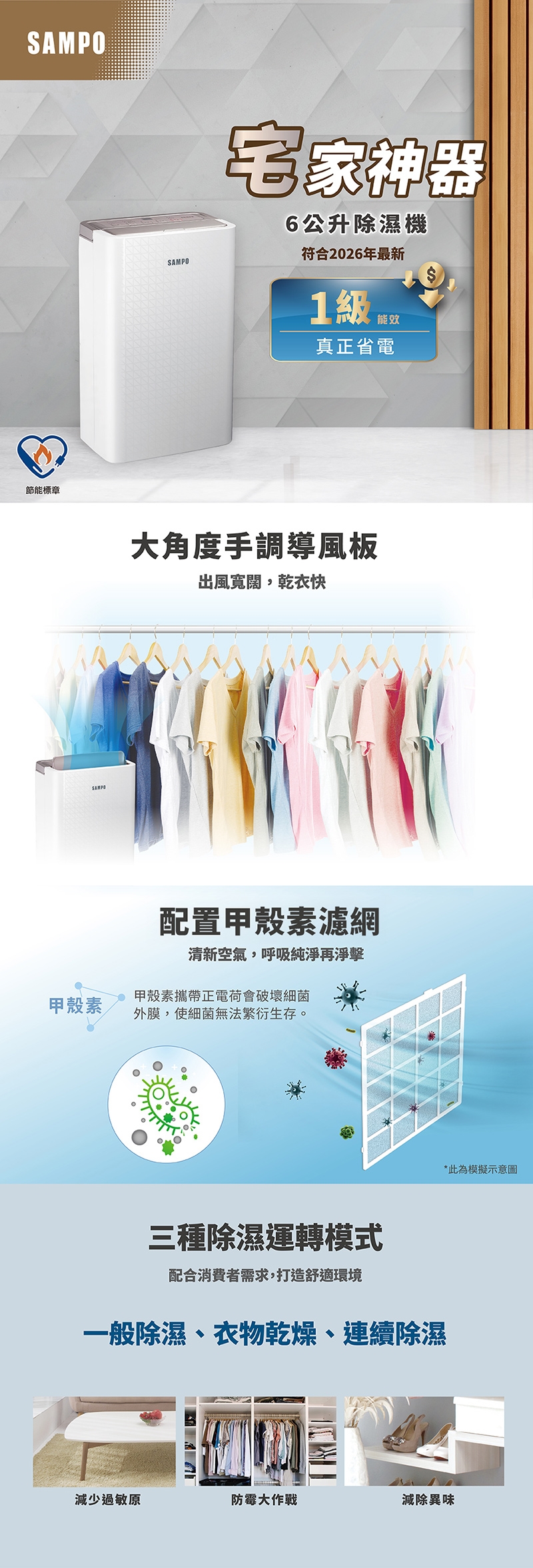 ◆6L/日除濕能力,遠離潮濕的危害,打造乾爽健康的家。