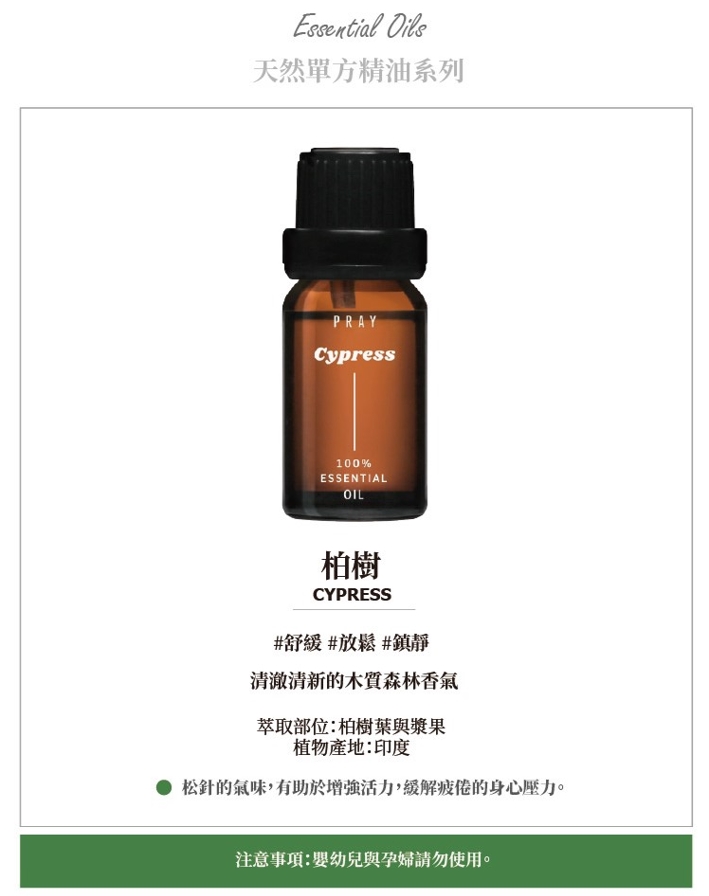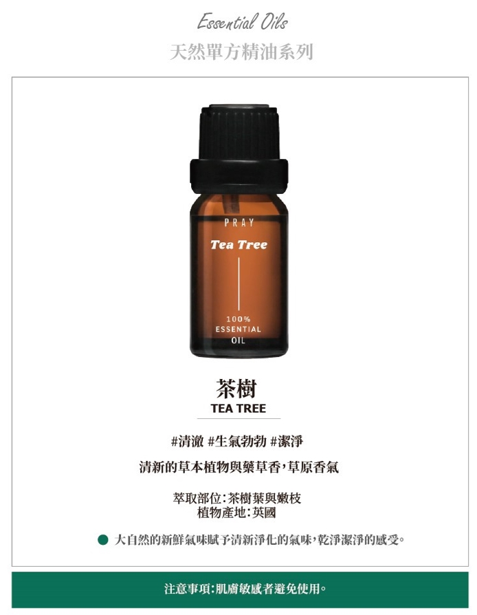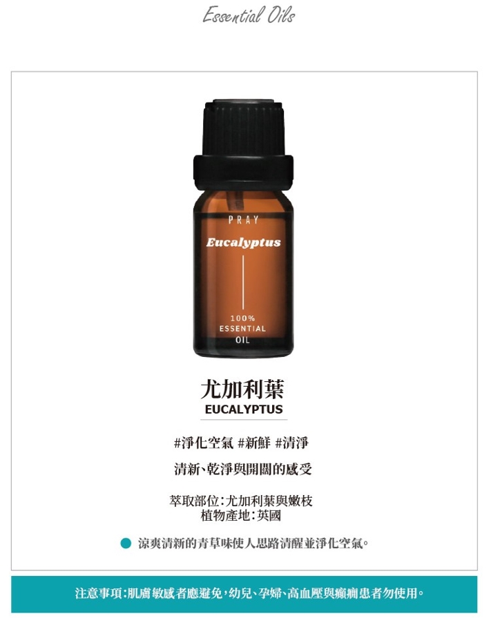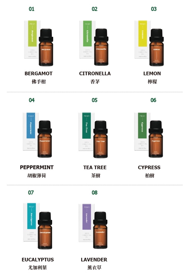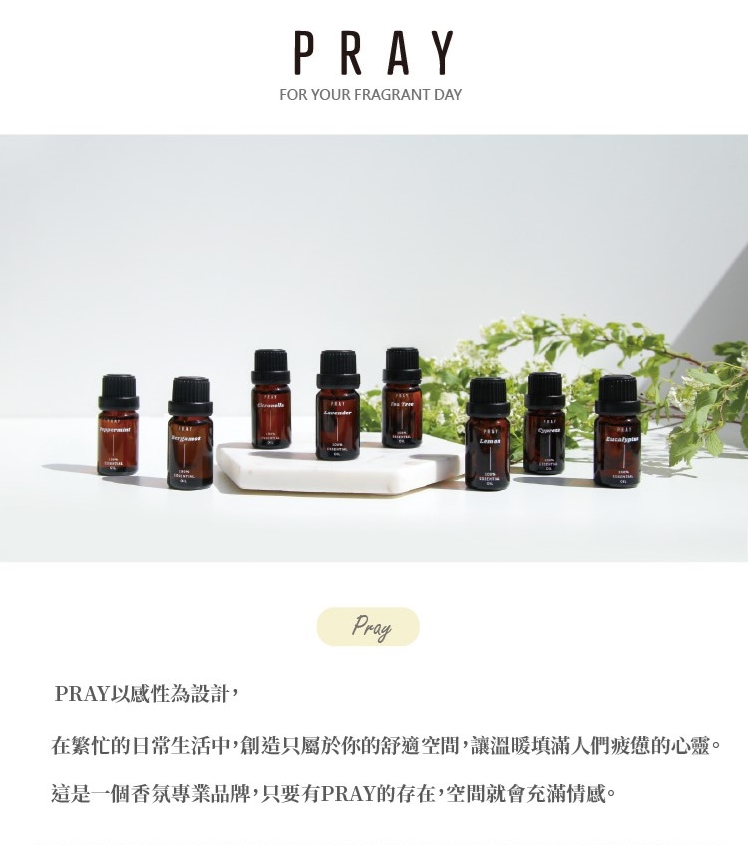 韓國釜山製作,從英國、印度、進口的茶樹、柏樹、尤加利葉中萃取出的純100%精油,可使用在不同的香氛療法中,透過PRAY天然精油達到身、心、靈的平衡,療癒放鬆或提振精神。