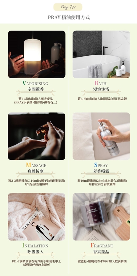 空間薰香:將2-5滴精油滴入薰香產品(PRAY水氧機、擴香儀、擴香石......)