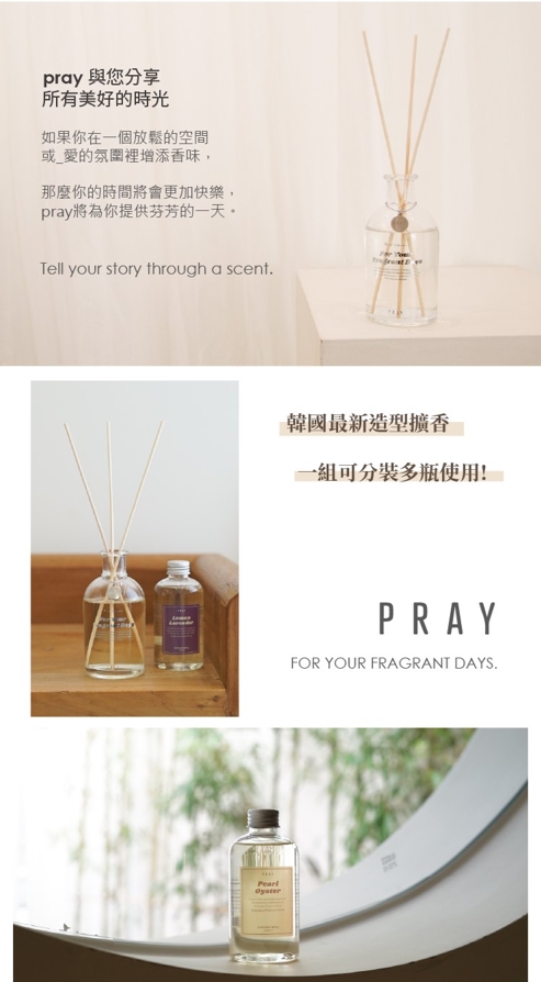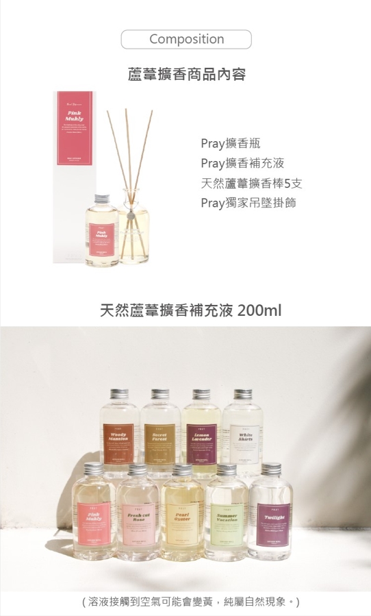 商品內容:PRAY擴香瓶x1、PRAY擴香補充液x1、天然蘆葦擴香棒5支、PRAY獨家吊墜掛飾x1