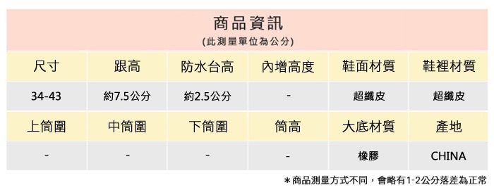 2.鞋類商品依功能及用途之不同,鞋底各有其止滑係數之個別不同,使用鞋類商品請用於正常平坦之路面,非雨鞋或雨靴類商品,請避免穿著於下雨濕滑路面上行走。